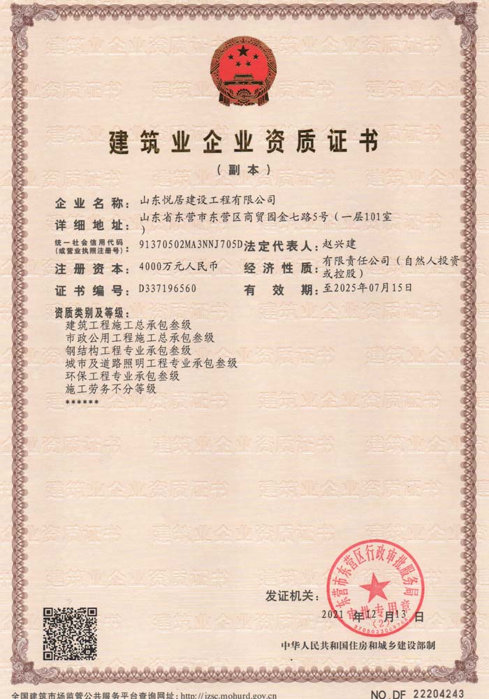 悦居施工总承包资质